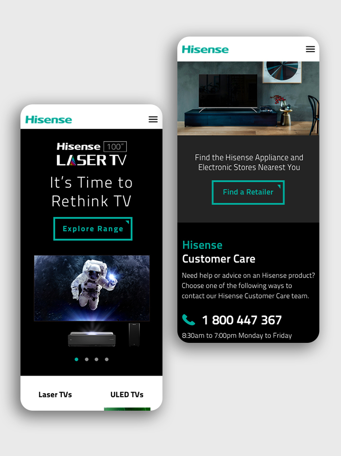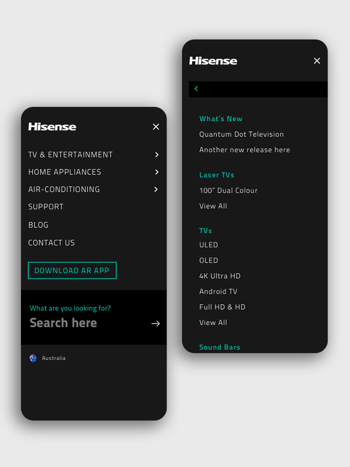 Subtlety was key when revising the designs – we still had to keep in line with Hisense brand, follow best-in-practice UI standards and ensure regional UI components were incorporated. Despite these requirements, we were still able to modernise the design by changing font-sizes, line-heights and lengths and optimising the colours to ensure AA accessibility and a clear user journey.