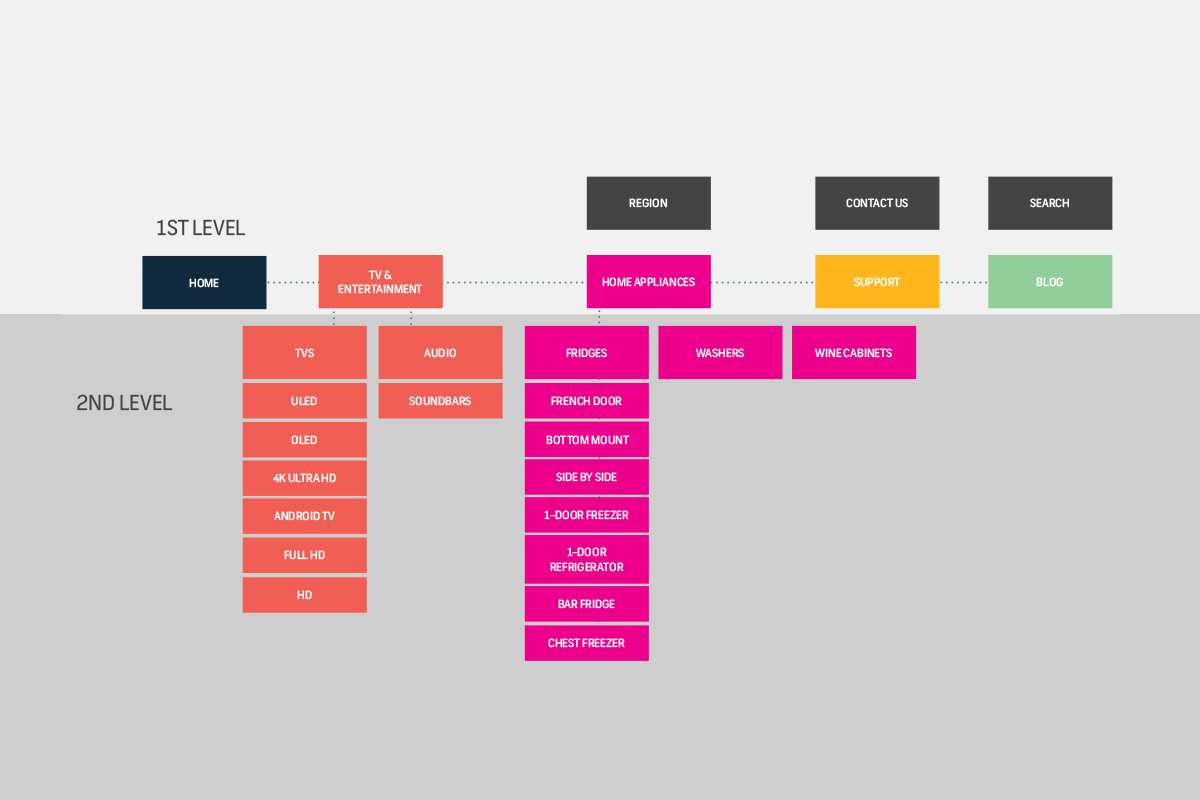 Based on our audit and research I created high fidelity wireframes for the key pages. I then tested them with a new user group – the results were overwhelmingly positive. On the original site, only 25% of users were able to find the TV and Fridge range page. That percentage increased to 100% of users when they trialled my wireframes.